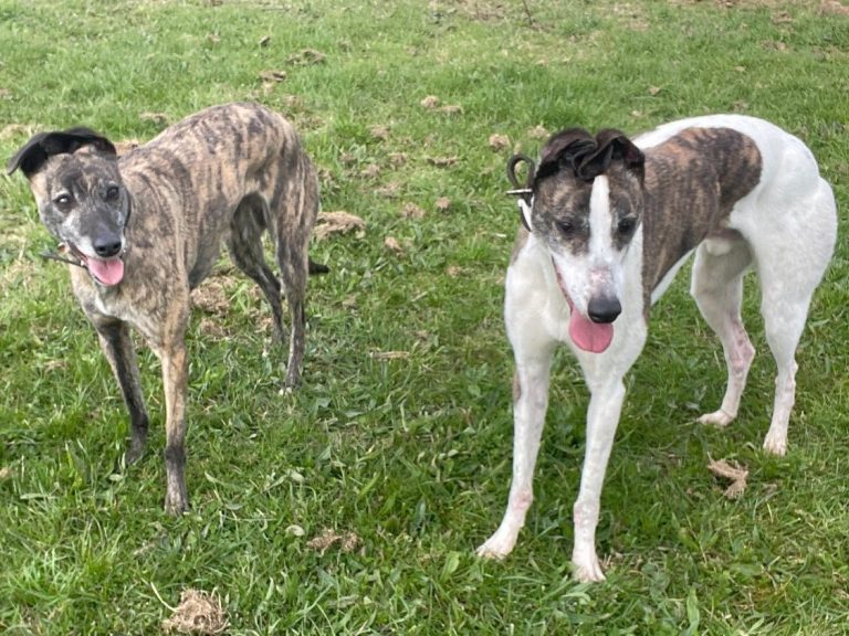Both are typical Whippets—gentle, affectionate, but both love off lead time together they never leave each others sides.